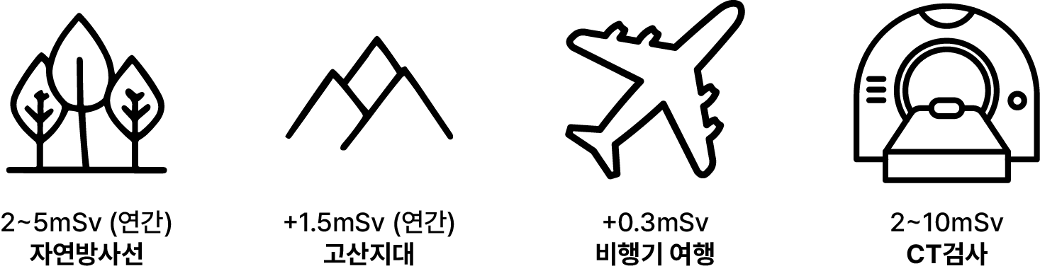 우리가 일상생활을 하면서도 자연 상에 존재하는 방사성 물질에 의해 방사선에 노출되게 되는데, 이러한 자연 방사선량은 연간 약 2~5mSv 정도로 알려져 있습니다. 고산 지대에 사는 경우 해수면 높이에 사는 사람보다 연간 약 1.5mSv, 비행기 여행을 하는 경우 약 0.3mSv 정도의 방사선에 더 노출됩니다. CT검사의 경우 촬영 기법에 따라 2~10mSv 정도 노출되며, 이는 약 8개월에서 3년간 일상에서 노출되는 정도의 방사선량입니다.